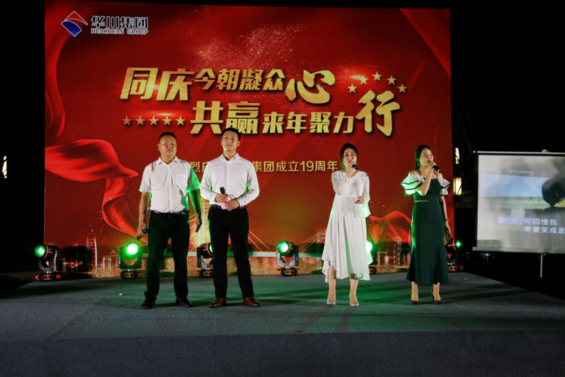 晚上,农业总部基地灯火熠熠,集团19周年庆典晚会在这里举行。作为十九周年与二十周年的连接节点,今晚过后将迎来集团成立二十周年华诞,党委副书记发布《关于庆祝集团成立二十周年氛围营造工作的通知》,副总裁熊文发布《休养度假专项福利方案》。发布会后,一曲《盛世华诞》鼓舞划破夜空,激烈昂扬鼓声将拉开了庆典的序幕。《今天是你的生日》,通过词语改编,为集团送上了美好的生日祝福;群舞《别样风华》,通过集团女干部与文工团温婉柔美,犹如一幅曼妙的画卷;朗诵加合唱的节目《华川力量》,字字铿锵,展示出华川人血脉里流淌的豪迈情怀和磅礴的力量。伴随着晚风习习,周年庆典进入尾声,在《华川之歌》的歌声中,大家自发走上舞台,齐声合唱,伴随着熟悉的曲调,大家连连欢呼,为本次庆典划上了圆满的句号。